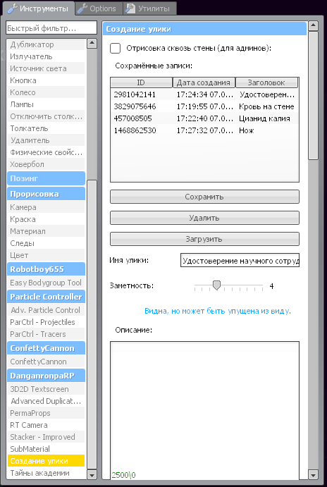 • Сохранённые записи - после заполнения всех пунктов можно сохранить улику и использовать в будущем.