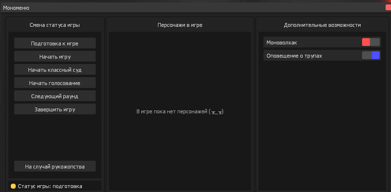 Чтобы вызвать «Мономеню» необходимо выбрать Монокуму и написать в чате !monomenu.